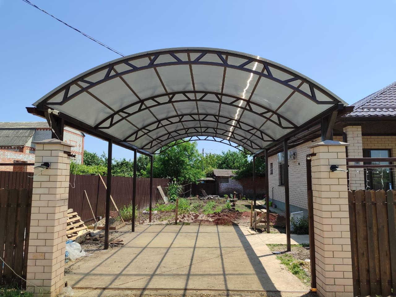 Столбы – труба 80х80 мм Фермы, прогоны – труба 40х20 мм Покрытие – грунт-эмаль 3в1 (цвет на выбор) Поликарбонат Полигаль Практичный 8 мм Водосточная система по одной стороне