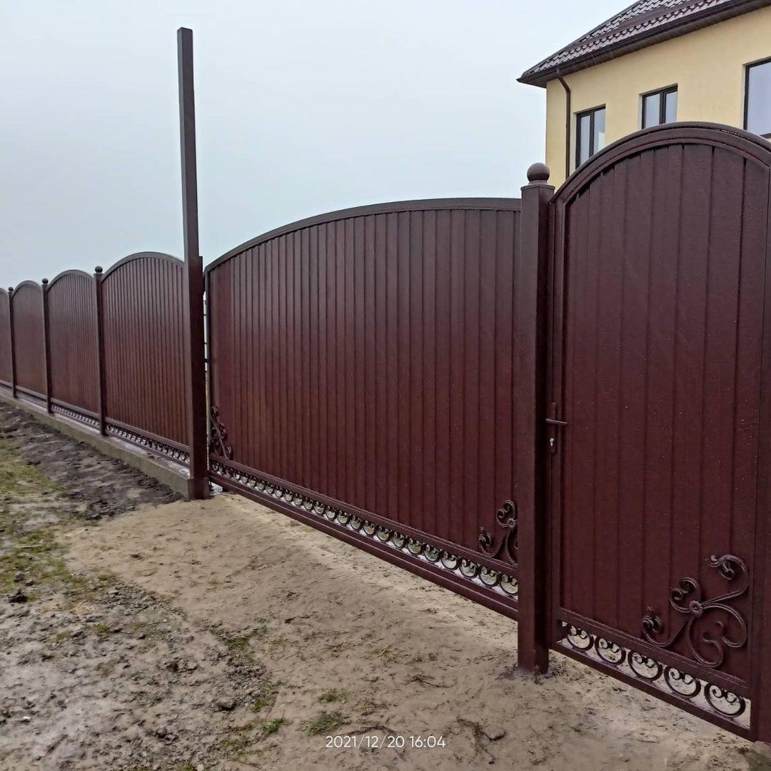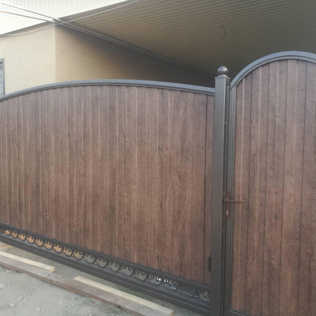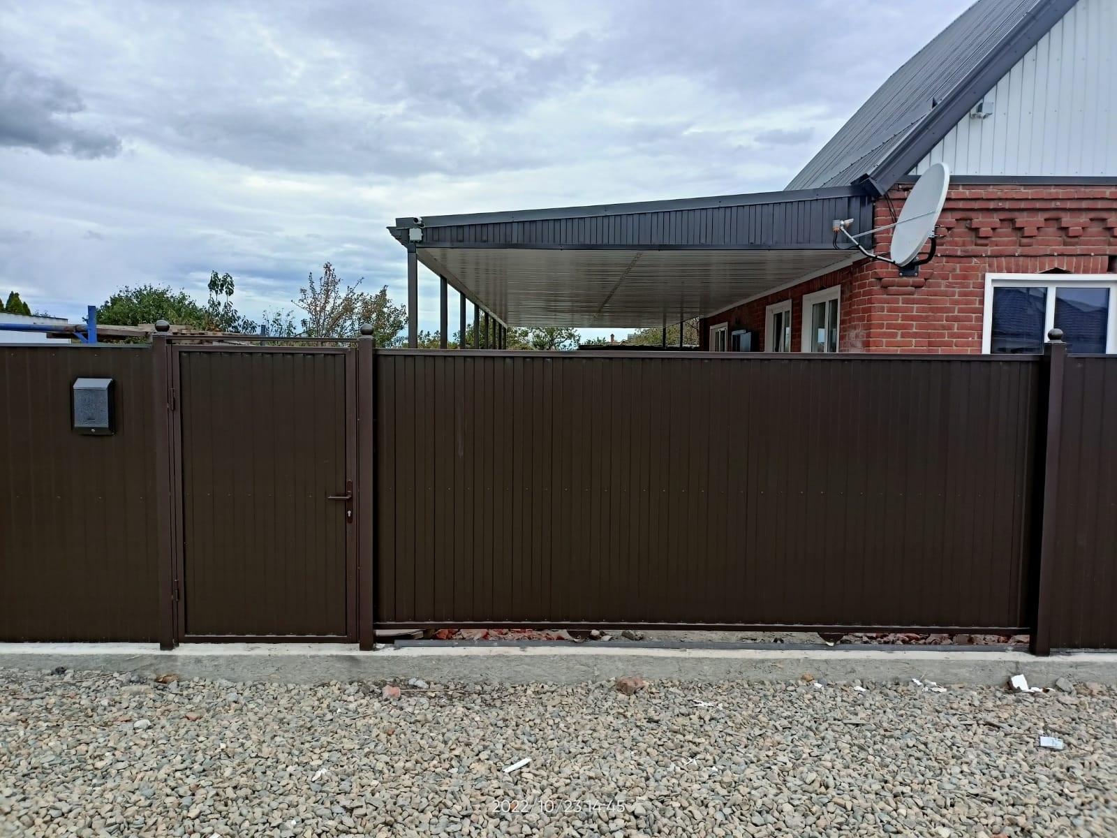 Столбы – труба 80х80 мм, Каркас – труба 60х40 мм, Наполнение – труба 15х15, 30х20, Консольная балка, Покрытие – грунт-эмаль 3в1 (цвет на выбор), Обшивка – профнастил, штакетник металлический, композит.
