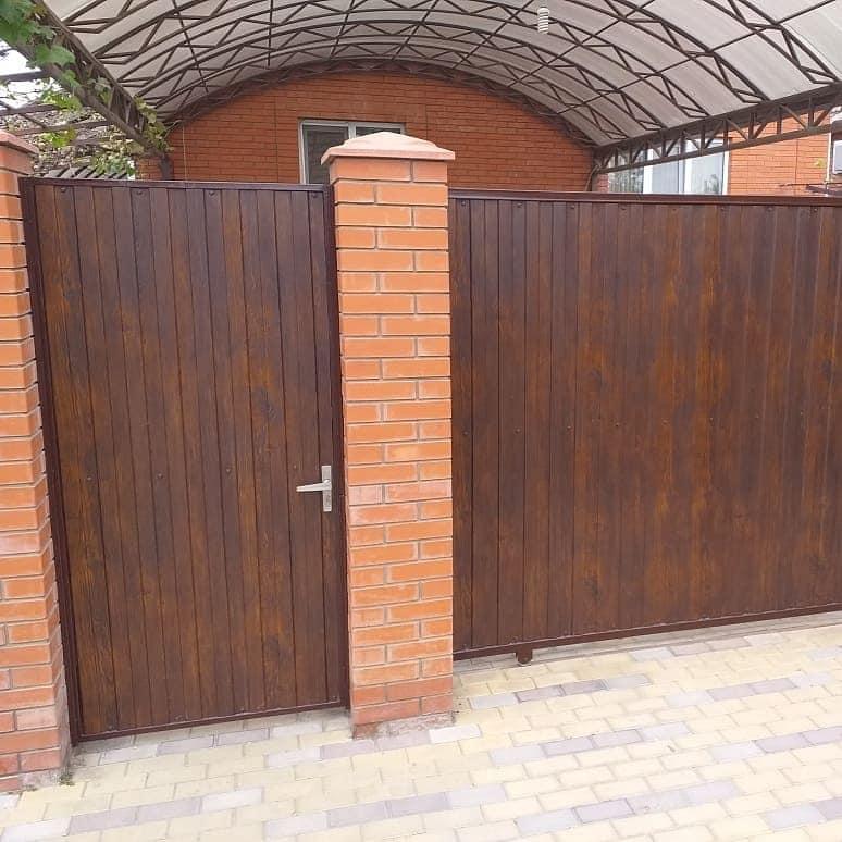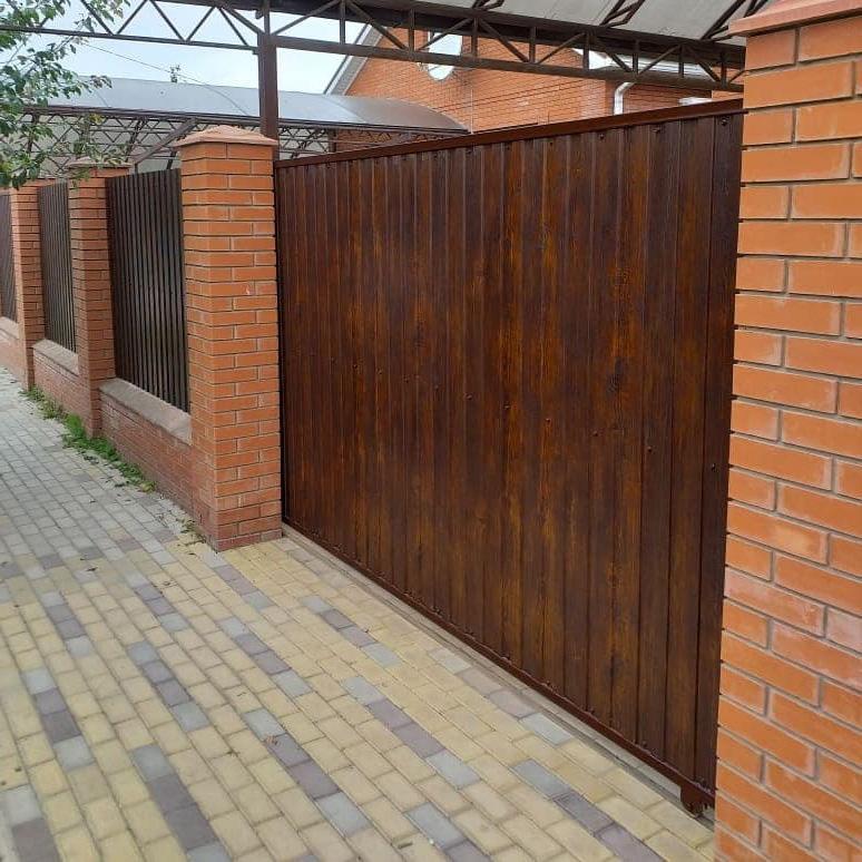 Столбы – труба 60х40 мм Прогоны – труба 30х20 мм Покрытие – грунт-эмаль 3в1 коричневая Профнастил С-8, 0,45 мм, античный дуб