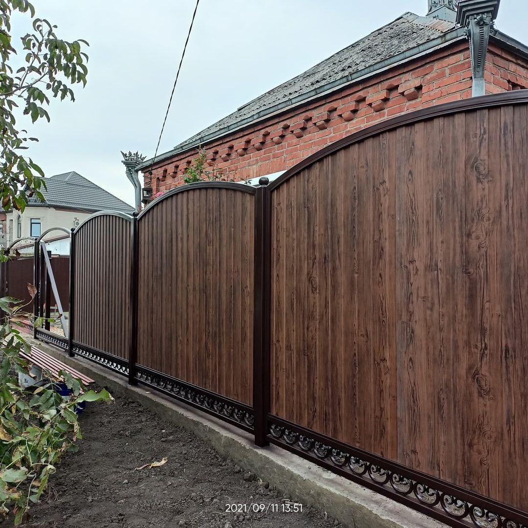 Столбы – труба 80х80 мм, Рамка секции – труба 40х40 мм, Наполнение секции – труба 15х15, 30х20, Покрытие – грунт-эмаль 3в1 (цвет на выбор), Профнастил С-8, 0,45 мм, античный дуб.